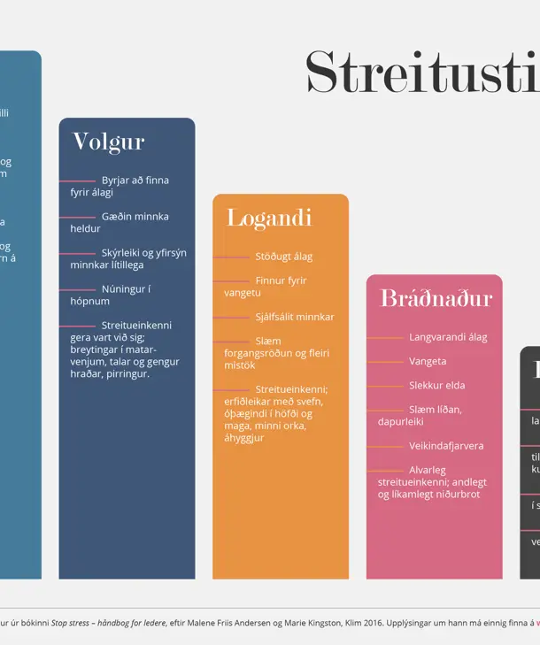 Marie Kingston, vinnusálfræðingur og höfundi bókarinnar Stop stress og Streitustigans hélt vinnustofu þar sem kynnt voru ýmis ráð og verkfæri sem vinnustaðari geta notað til að takast á við streitu og kulnun. Bæði var um að ræða hugmyndir og verkfæri sem hægt er að nota í forvarnaskyni en einnig til að takast að við streitu sem hefur náð að þróast um lengir í tíma og stefnir í kulnun.